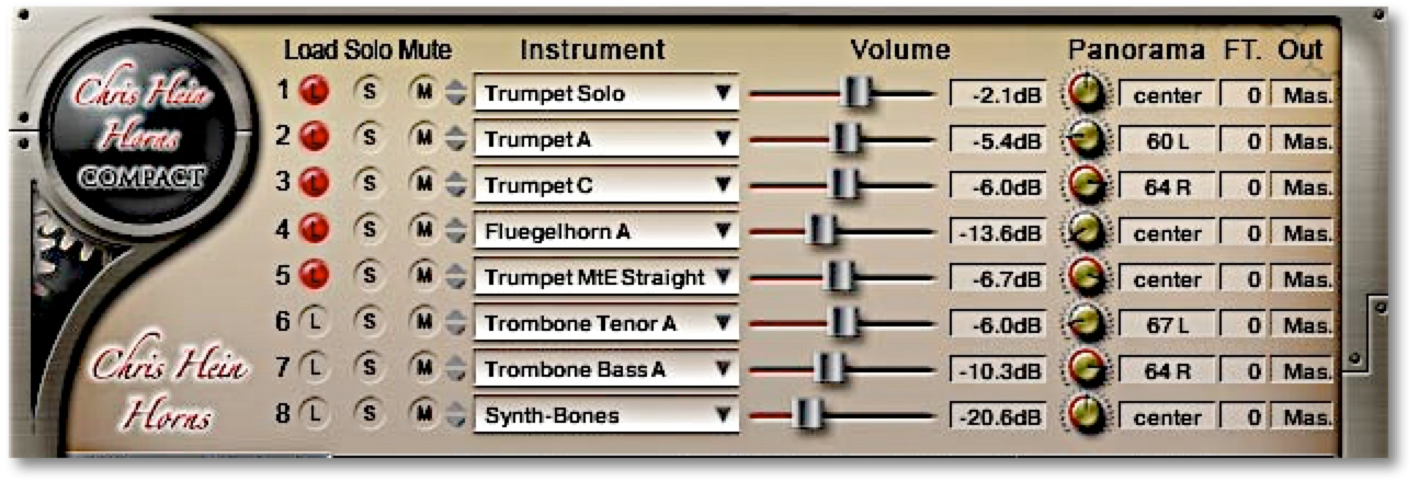 If you need more instruments playing simultaneously, simply open a second Multi-Instrument in your Kontakt-Player. The dropdown menu lets you assign any of the 53 Solo-Instruments and 6 Synth-Brass instruments into any of the 8 channels.