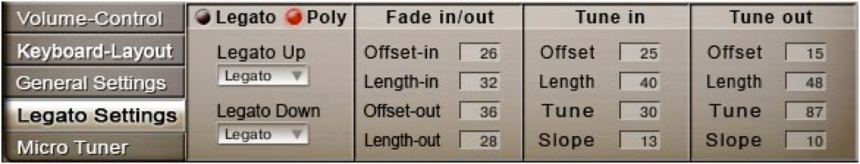 When playing a note, holding it, and playing another note, the Legato performs a smooth transition between the two notes. You can edit the behavior of the Legato transition in detail in the Legato- Settings Page. Playing in Legato Mode is always monophonic.