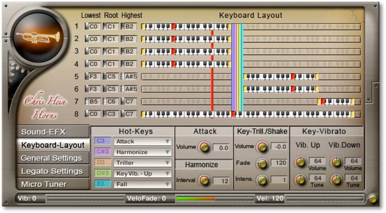 are special keys which are used to trigger different effects and articulations. The position of the Hot-Keys can be set to any key. You can even assign two Hot-Keys to the same note, if you feel that makes sense. The position of each Hot-Key is represented by a uniquely colored bar in the Keyboard Layout.