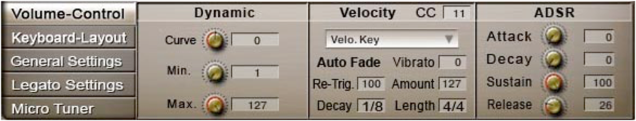 Velo Fade - When this is selected, the velocity is controlled via midi Control Change (CC11, Expression, by default). You can also use any other controller by changing the Velo Fade CC. Setting the controller to zero, plays the lowest velocity layer, moving the controller up, fades between the velocity layers while increasing the value crossfades between the velocity layers until the highest value of 127 is reached.