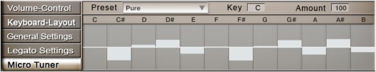 All samples in CHH are perfectly tuned to the standard chromatic scale with A at 440Hz. However, real brass players usually don‘t play perfectly in tune. You can edit the tuning in precise detail, in the Micro-Tuning Page. You can create your own tuning scales by shifting the tuning of each note up or down, or you can use one of the pre-programmed tuning scales based on some of the most famous historical scales.