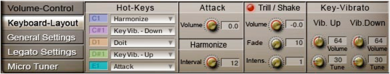 Triller - Switches to a real played trill on saxophones & clarinets and a real played Shake on Trumpets & Trombones. Volume and Fade Time can be set in the Key-Trill./Shake section. Instead of using a Hot-Key you can also use the Intens knob to adjust the intensity of the Trill/Shake via midi CC.